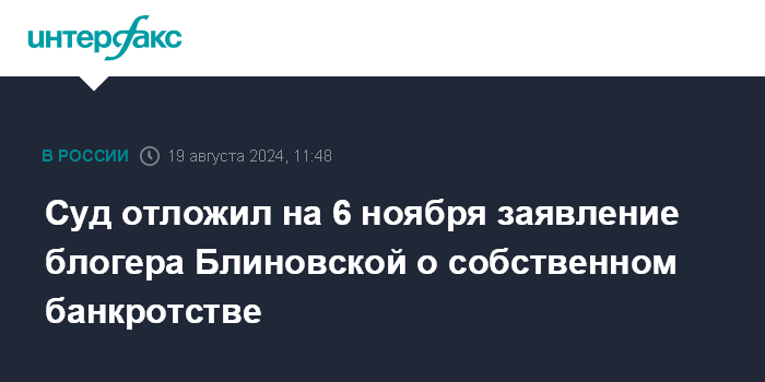 Москва. 19 августа. INTERFAX.RU - Арбитражный суд Москвы в понедельник отложил на 6 ноября рассмотрение заявления блогера и основательницы проекта "Марафон желаний" Елены Блиновской о собственном банкротстве.