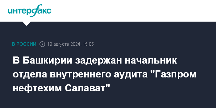 Москва. 19 августа. INTERFAX.RU - В Башкирии задержан начальник отдела внутреннего аудита ООО "Газпром нефтехим Салават" (ГНС), сообщило региональное управление ФСБ. Его подозревают в получении взятки в особо крупном размере.