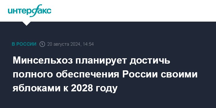 Москва. 20 августа. INTERFAX.RU - Россия планирует к 2028 году достичь полного обеспечения яблоками собственного производства, заявила министр сельского хозяйства Оксана Лут во время посещения президентом Владимиром Путиным садоводческого хозяйства ООО "Агро 07" в Кабардино-Балкарии.