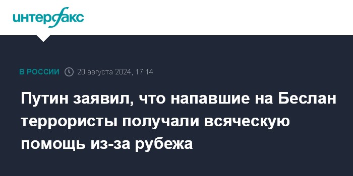Москва. 20 августа. INTERFAX.RU - Напавшие на Беслан террористы получали политическую, финансовую и военную поддержку из-за рубежа, заявил президент РФ Владимир Путин.