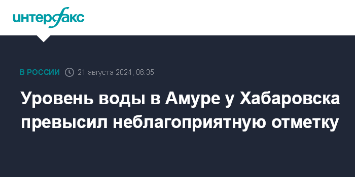 "Уровень воды в реке Амур у Хабаровска на 6 см превысил отметку неблагоприятного явления. По прогнозам гидрологов в ближайшие дни рост продолжится и к 25-27 августа может достигнуть отметки 500 см", - говорится в сообщении.