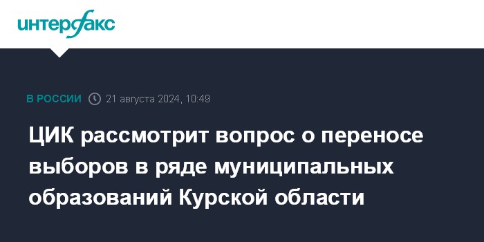 Москва. 21 августа. INTERFAX.RU - Центризбирком России на заседании в среду рассмотрит возможность отложить проведение выборов на территориях ряда муниципальных образований Курской области, говорится в повестке заседания комиссии.