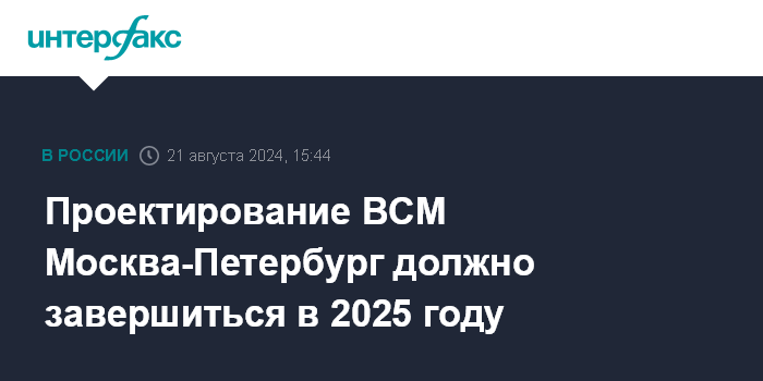 Москва. 21 августа. INTERFAX.RU - Проектирование высокоскоростной железнодорожной магистрали Москва - Санкт-Петербург завершится в 2025 году, говорится в презентации гендиректора ООО "ВСМ Две столицы" Олега Тони, представленной в Петербурге.
