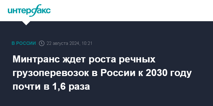 Москва. 22 августа. INTERFAX.RU - Российский Минтранс к 2030 году ждет значительного роста перевозок пассажиров и грузов речным флотом, сообщил телеканалу "Россия-24" руководитель ведомства Роман Старовойт.