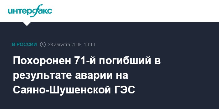 Авария на Саяно-Шушенской ГЭС произошла 17 августа. В результате станция была остановлена, разрушено здание машинного зала. По последним данным, погиб 71 человек, четверо числятся пропавшими без вести. Идет расследование причин аварии.