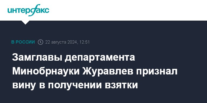 Москва. 22 августа. INTERFAX.RU - Заместитель директора Департамента координации деятельности организаций в сфере сельскохозяйственных наук Минобрнауки Дмитрий Журавлев, арестованный по делу о получении особо крупной взятки, полностью признал вину, следует из материалов суда.