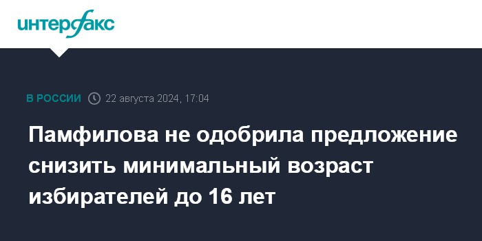 Москва. 22 августа. INTERFAX.RU - Председатель Центризбиркома России Элла Памфилова не поддержала предложение снизить минимальный возраст избирателей в стране до 16 лет и отметила, что в таком возрасте подростки не готовы нести ответственность за свой выбор. Она заявила об этом на форуме "Территория смыслов" платформы "Росмолодежь.События".
