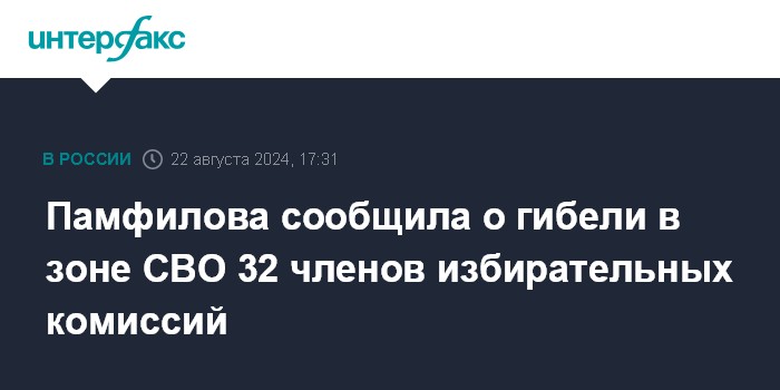 Москва. 22 августа. INTERFAX.RU - В зоне специальной военной операции погибли 32 члена избирательных комиссий, сообщила на форуме "Территория смыслов" председатель Центризбиркома России Элла Памфилова.