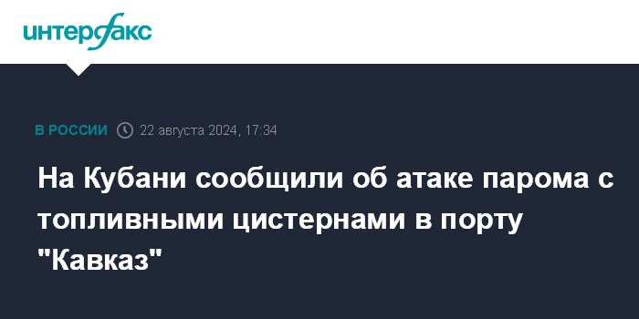 Москва. 22 августа. INTERFAX.RU - В Темрюкском районе Краснодарского края в порту "Кавказ" атакован железнодорожный паром с топливными цистернами, начался пожар, сообщает оперативный штаб региона.