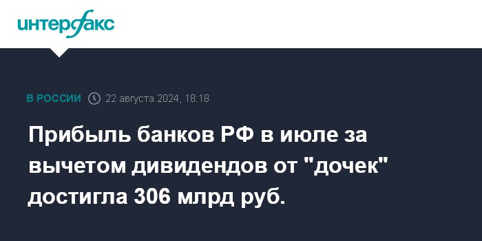 Прибыль банков РФ в июле за вычетом дивидендов от "дочек" достигла 306 млрд руб.