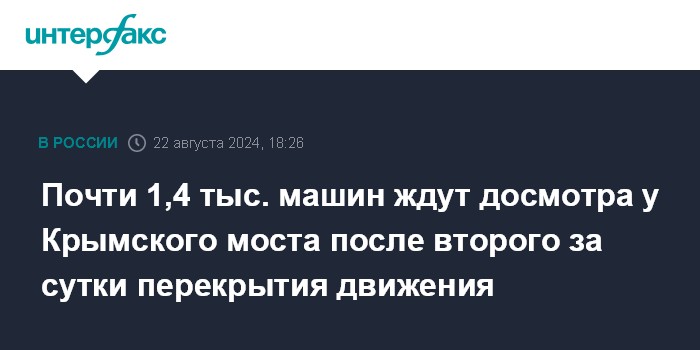 Москва. 22 августа. INTERFAX.RU - Очереди к досмотровым пунктам на Крымском мосту в четверг днем выросли суммарно с двух сторон почти до 1,4 тыс. автомобилей после того, как мост был во второй раз перекрыт более чем на час. Об этом сообщает телеграм-канал, освещающий ситуацию на автомобильных подходах к мосту.