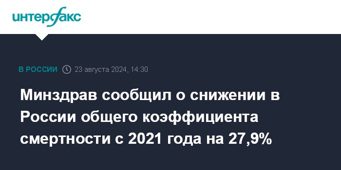 Москва. 23 августа. INTERFAX.RU - В России общий коэффициент смертности снизился почти на 28% по сравнению с 2021 годом; сократилась смертность населения от основных причин, сообщили в Минздраве.