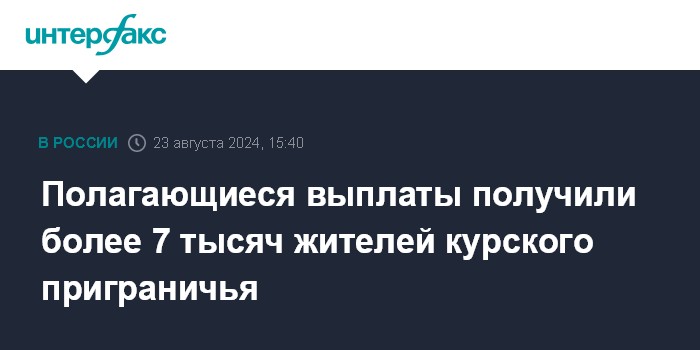 Москва. 23 августа. INTERFAX.RU - Более 7 тысяч жителей приграничных районов Курской области, вынужденно покинувшие свои дома, получили причитающиеся им выплаты, сообщил на брифинге представитель МЧС России Артем Шаров.