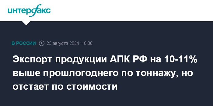 Экспорт продукции АПК РФ на 10-11% выше прошлогоднего по тоннажу, но отстает по стоимости