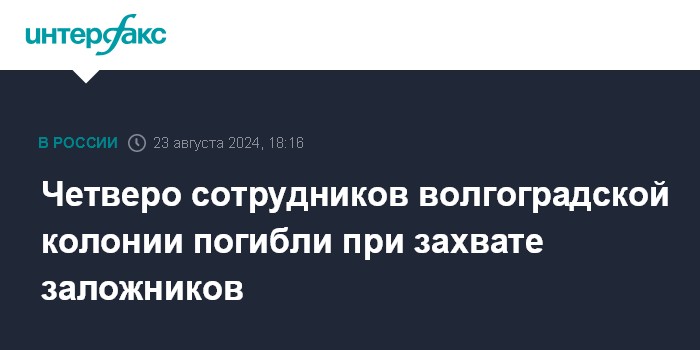 Москва. 23 августа. INTERFAX.RU - ФСИН сообщила о гибели четверых сотрудников колонии в Волгограде, где произошел захват заложников, еще трое сотрудников госпитализированы.