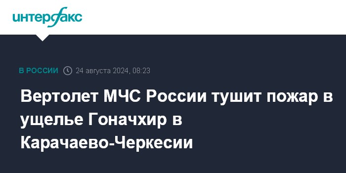 Москва. 24 августа. INTERFAX.RU - Вертолет тушит лесной пожар в Гоначхирском ущелье в Карачаево-Черкесии, сообщает МЧС РФ утром в субботу.