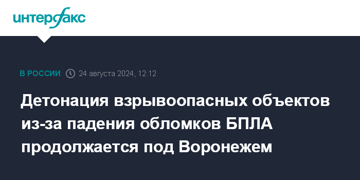 Москва. 24 августа. INTERFAX.RU - Глава Острогожского района Воронежской области Сергей Хорошилов сообщил о продолжающейся детонации взрывоопасных объектов, которая произошла минувшей ночью после падения обломков беспилотников.