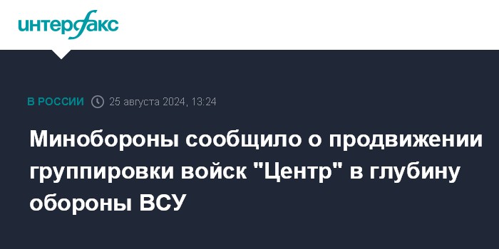 Москва. 25 августа. INTERFAX.RU - Войска группировки "Центр" продолжают движение вглубь обороны ВСУ, группировка "Днепр" нанесла удары по украинским силам в районе Херсона, сообщили в воскресенье в Минобороны РФ.