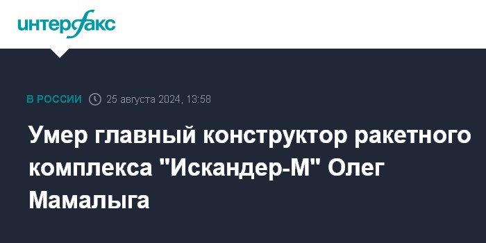 Москва. 25 августа. INTERFAX.RU - Главный конструктор ракетного комплекса "Искандер-М" Олег Мамалыга скончался на 92-м году жизни, сообщил в воскресенье холдинг "Высокоточные комплексы".