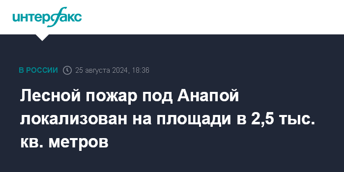 Москва. 25 августа. INTERFAX.RU - Пожарные локализовали возгорание в районе села Сукко под Анапой на площади 2,5 тыс. кв. метров, сообщает в воскресенье оперштаб Кубани.
