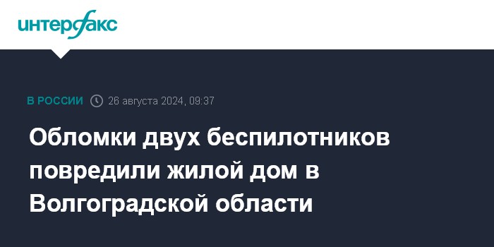 Москва. 26 августа. INTERFAX.RU - Жилой дом и два нежилых строения повреждены в результате падения обломков двух БПЛА в Еланском районе Волгоградской области в понедельник утром, пострадавших нет. Об этом сообщает пресс-служба администрации региона со ссылкой на губернатора Андрея Бочарова.