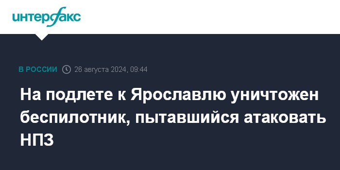 Москва. 26 августа. INTERFAX.RU - Губернатор Ярославской области Михаил Евраев сообщил об уничтожении беспилотника, который пытался атаковать нефтеперерабатывающий завод (НПЗ).