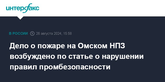 Москва. 26 августа. INTERFAX.RU - По факту пожара на Омском НПЗ возбуждено уголовное дело о нарушении требований промышленной безопасности опасных производственных объектов, повлекшем по неосторожности причинение тяжкого вреда здоровью человека (ч.1 ст.217 УК), сообщило управление Следственного комитета Омской области.