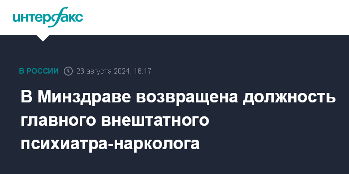 Москва. 26 августа. INTERFAX.RU - В российском Минздраве возвращена должность главного внештатного психиатра-нарколога, которая ранее была исключена из номенклатуры специалистов министерства, сообщил сайт ведомства.