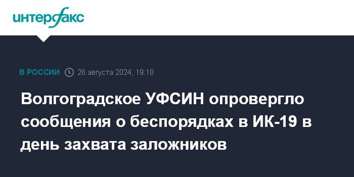 Москва. 26 августа. INTERFAX.RU - УФСИН по Волгоградской области назвало недостоверной распространяемую в интернете информацию о беспорядках в колонии №19 в Суровикине утром 23 августа, в день захвата заложников, сообщила пресс-служба управления.