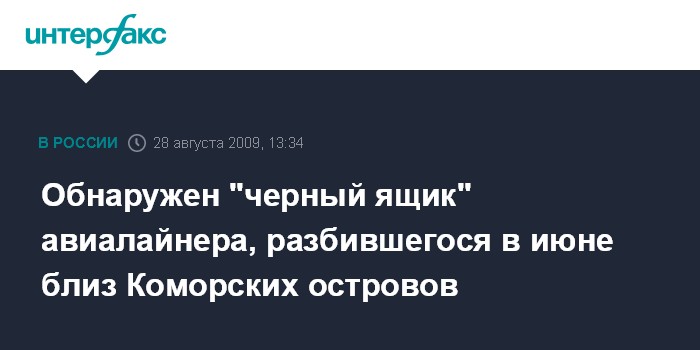 Париж. 28 августа. INTERFAX.RU - "Черный ящик" лайнера авиакомпании Yemenia Airlines, разбившегося 30 июня близ Коморских островов, обнаружен, сообщил в пятницу французский телеканал ТФ1, который процитировал коммюнике коморской комиссии по расследованию происшествия.