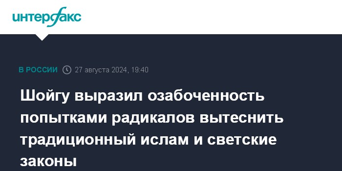 Москва. 27 августа. INTERFAX.RU - Попытки вытеснить светские законы и традиционный ислам радикальной идеологией вызывают особенную озабоченность, заявил секретарь Совбеза РФ Сергей Шойгу.