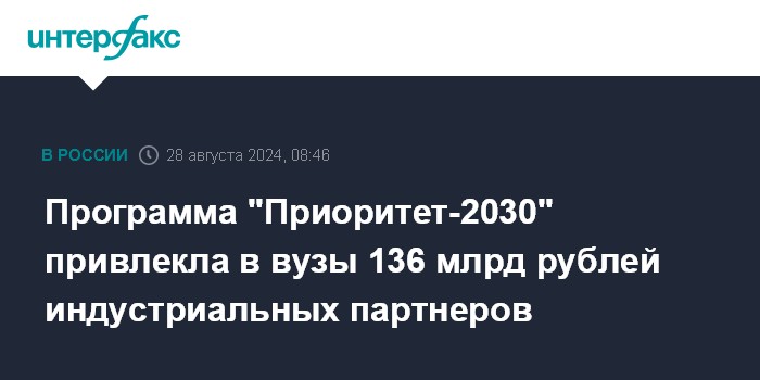 Москва. 28 августа. INTERFAX.RU - Программа поддержки вузов "Приоритет-2030" за время своего существования помогла привлечь от индустриальных партнеров 136 млрд рублей, сообщил на форуме "Технопром-2024" вице-премьер Дмитрий Чернышенко.