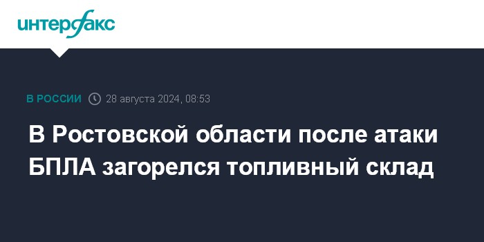 Москва. 28 августа. INTERFAX.RU - В Каменском районе Ростовской области в результате атаки беспилотника начался пожар на топливном складе , сообщил в своем телеграм-канале губернатор региона Василий Голубев.