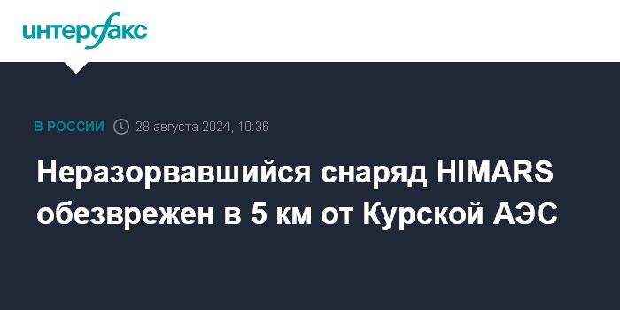 "Инженерно-разведывательная группа Росгвардии получила информацию о том, что в Курской области в пяти километрах от атомной электростанции найден сбитый снаряд реактивной системы залпового огня HIMARS", - сообщили "Интерфаксу" в Росгвардии.