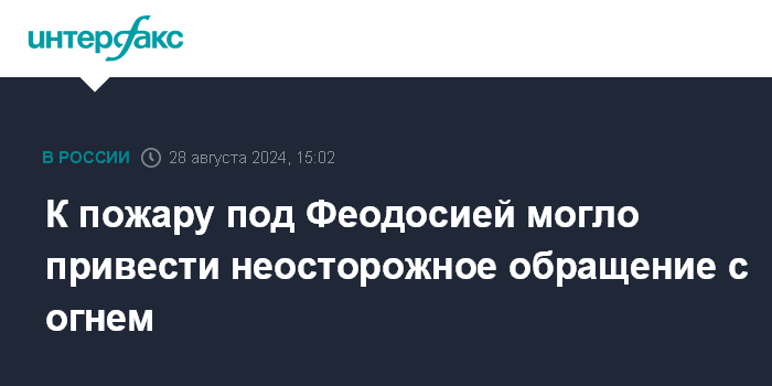 Москва. 28 августа. INTERFAX.RU - Неосторожное обращение с огнем рассматривается как основная версия возникновения пожара у горы Тепе-Оба под Феодосией, который распространился на площади 150 га, сообщил замначальника Главного управления МЧС России по республике Крым Игорь Скуртул.