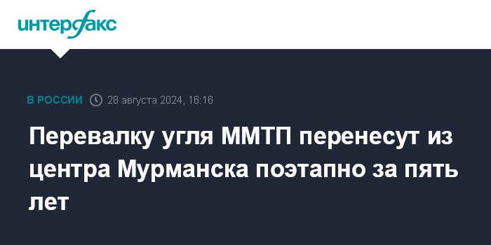 Москва. 28 августа. INTERFAX.RU - Перевалка угля в АО "Мурманский морской торговый порт" (ММТП, находится под управлением АО "Портовый альянс"), сопровождаемая выбросами угольной пыли, должна быть перенесена из центра Мурманска к 2030 году, сообщил губернатор региона Андрей Чибис на презентации обновленного плана "На Севере - жить".