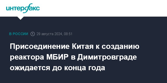 Москва. 29 августа. INTERFAX.RU - Присоединение КНР к консорциуму по созданию многоцелевого исследовательского реактора на быстрых нейтронах (МБИР), который строится в Димитровграде Ульяновской области, ожидается до конца года. Об этом сообщил директор международных научно-технических проектов ГК "Росатом", гендиректор компании "Лидер консорциума "МЦИ МБИР" Василий Константинов на форуме "Технопром-2024" в Новосибирске в четверг.