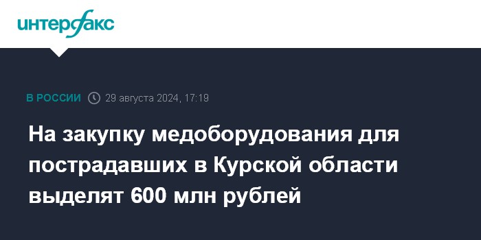 Москва. 29 августа. INTERFAX.RU - Правительство выделило около 600 млн рублей на закупку медицинского оборудования для пострадавших в Курской области, сообщает сайт правительства. Такое распоряжение подписал премьер-министр Михаил Мишустин.
