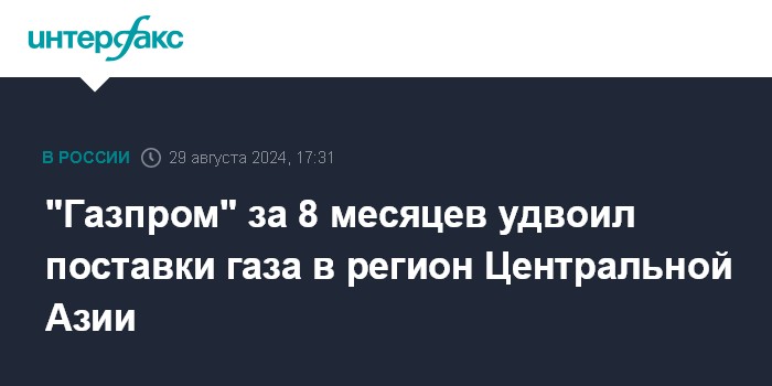 Москва. 29 августа. INTERFAX.RU - "Газпром" удвоил поставки газа в регион Центральной Азии, такие данные по итогам 8 месяцев 2024 года привел на селекторном совещании председатель правления "Газпрома" Алексей Миллер.