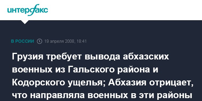 17 апреля глава Абхазии С.Багапш заявил, что Сухуми примет ответные меры в случае, если Грузия в течение суток не выведет свои военные подразделения, которые она вводит сейчас в Зугдидский район и верхнюю часть Кодорского ущелья.