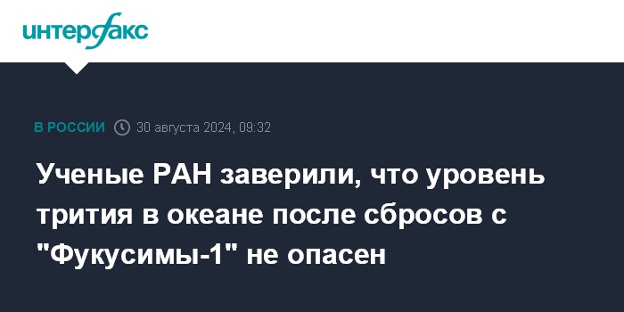 Москва. 30 августа. INTERFAX.RU - Превышение содержания трития в морской воде, выявленное российскими учеными по итогам экспедиции по оценке содержания радионуклидов в Тихом океане из-за сбросов вод с аварийной АЭС "Фукусима-1", не представляет угрозы. Об этом сообщил Тихоокеанский океанологический институт им. Ильичева (ТОИ) Дальневосточного отделения РАН.