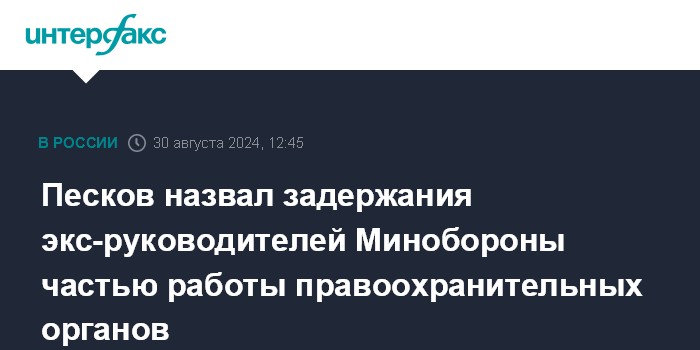 Москва. 30 августа. INTERFAX.RU - Задержание ряда бывших высокопоставленных сотрудников министерства обороны РФ - это часть планомерной и постоянной работы правоохранительных органов, заявил пресс-секретарь президента РФ Дмитрий Песков.