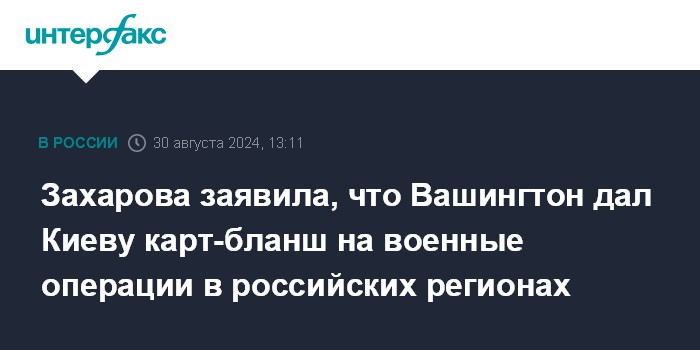 Захарова заявила, что Вашингтон дал Киеву карт-бланш на военные операции в российских регионах
