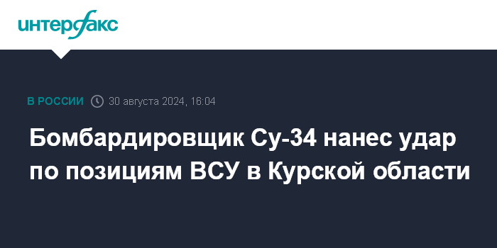 Москва. 30 августа. INTERFAX.RU - В министерстве обороны РФ сообщили, что бомбардировщик Су-34 ВКС России нанес удар по живой силе и бронетехнике ВСУ в приграничном районе Курской области.