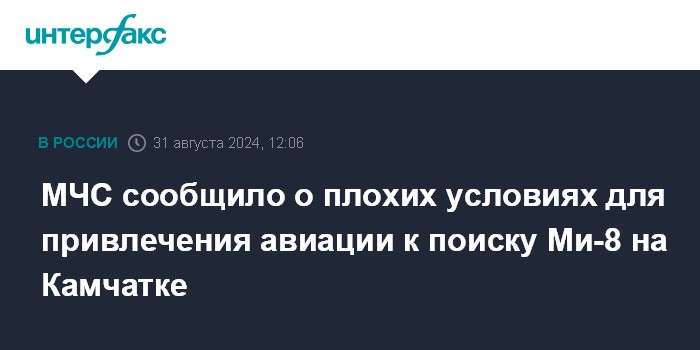 Москва. 31 августа. INTERFAX.RU - Погодные условия на Камчатке не позволяют привлечь авиацию к поиску пропавшего вертолета Ми-8, на борту которого находятся 22 человека, сообщила пресс-служба МЧС РФ в субботу.