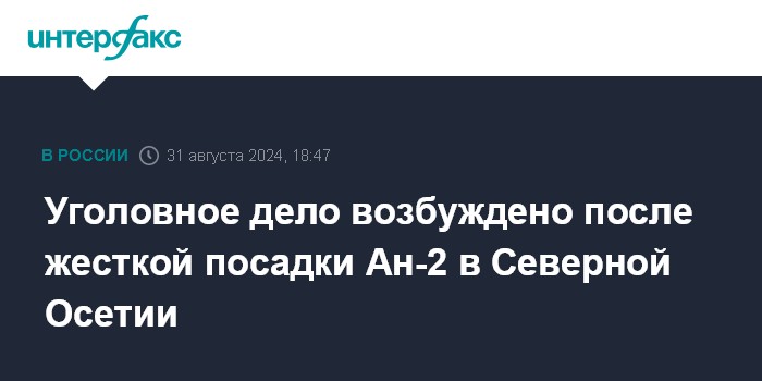 Москва. 31 августа. INTERFAX.RU - СК РФ возбудил дело по факту аварийной посадки самолета Ан-2 в Северной Осетии, сообщил официальный телеграм-канал военных следственных органов СКР.