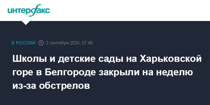 Москва. 2 сентября. INTERFAX.RU - Губернатор Белгородской области Вячеслав Гладков сообщил, что принято решение закрыть на неделю все школы на Харьковской горе в Белгороде.