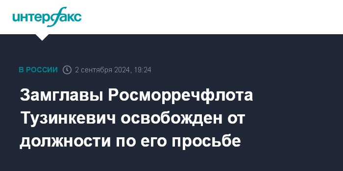 Москва. 2 сентября. INTERFAX.RU - Премьер-министр РФ Михаил Мишустин освободил заместителя руководителя Федерального агентства морского и речного транспорта (Росморречфлот) Евгения Тузинкевича от занимаемой должности по его просьбе.