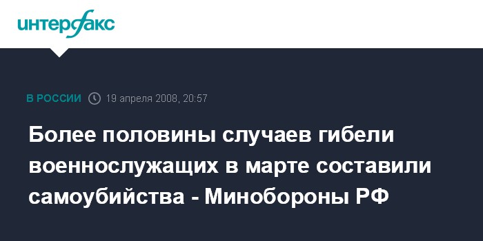 Москва. 19 апреля. ИНТЕРФАКС-АВН - В Вооруженных силах РФ в результате преступлений и происшествий при исполнении обязанностей военной службы в марте погибли 30 человек.