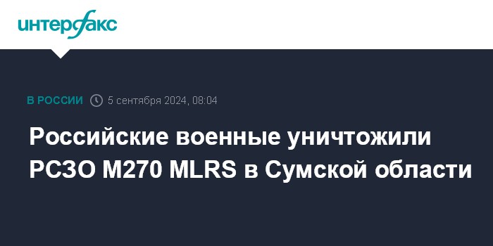 Москва. 5 сентября. INTERFAX.RU - Реактивная система залпового огня M270 MLRS уничтожена в Сумской области Украины, сообщили в министерстве обороны России.